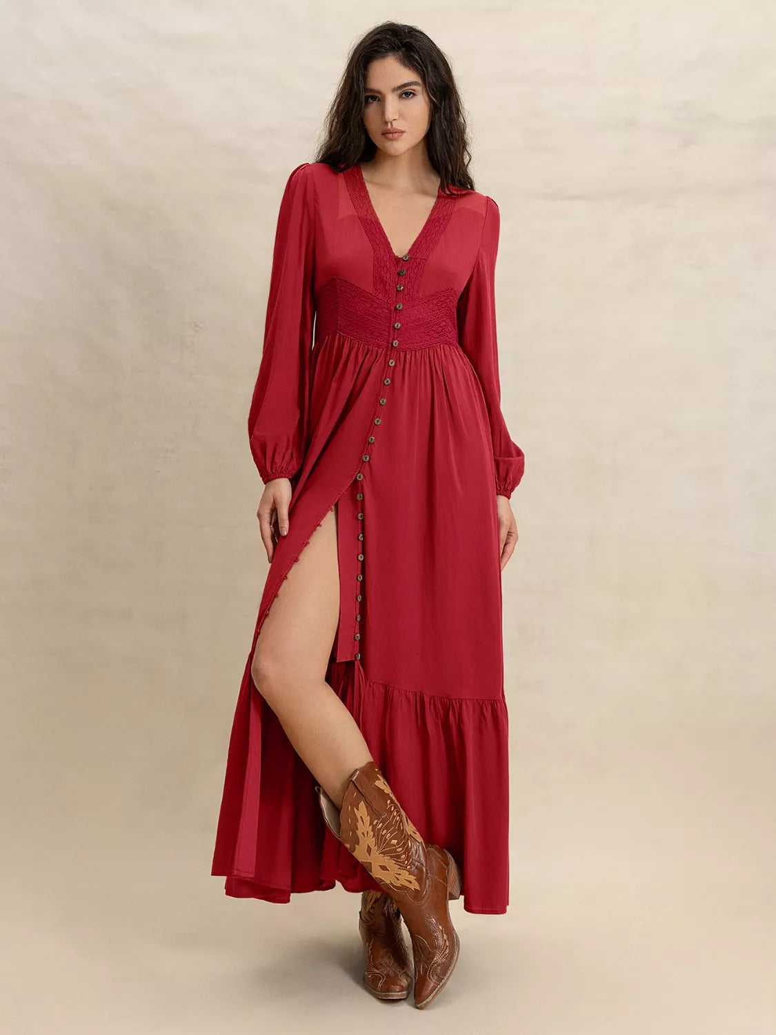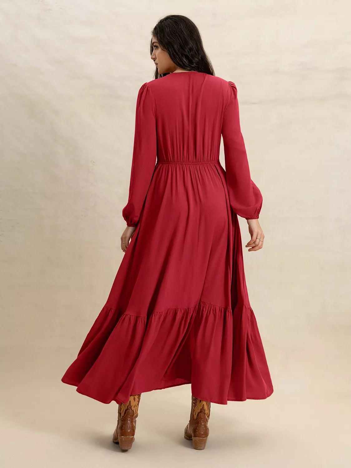 V-Neck Balloon Sleeve Ruffled Hem Maxi Dress