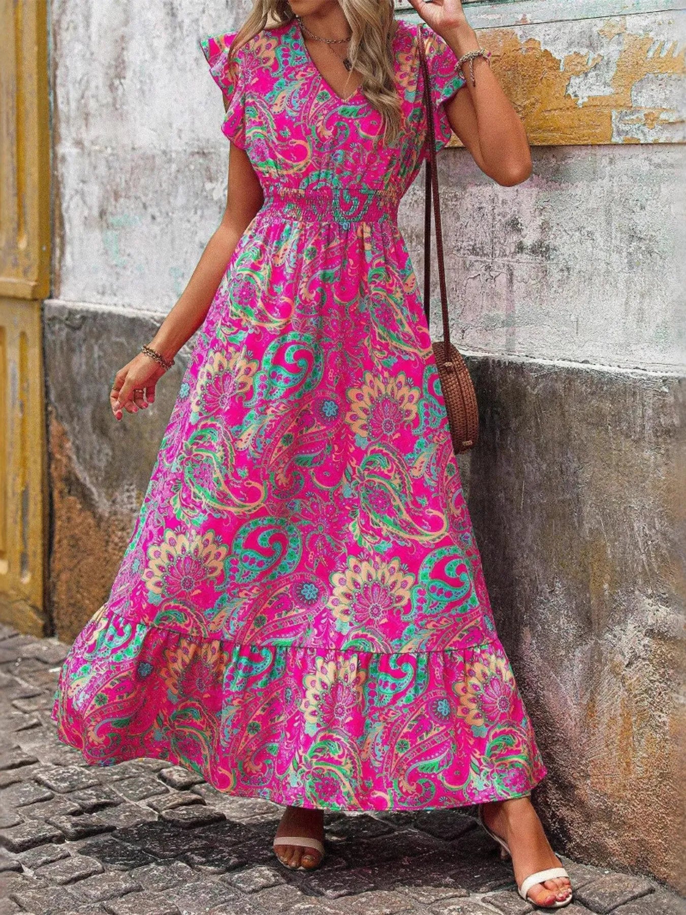Printed V-Neck Ruffled Cap Sleeve Maxi Dress